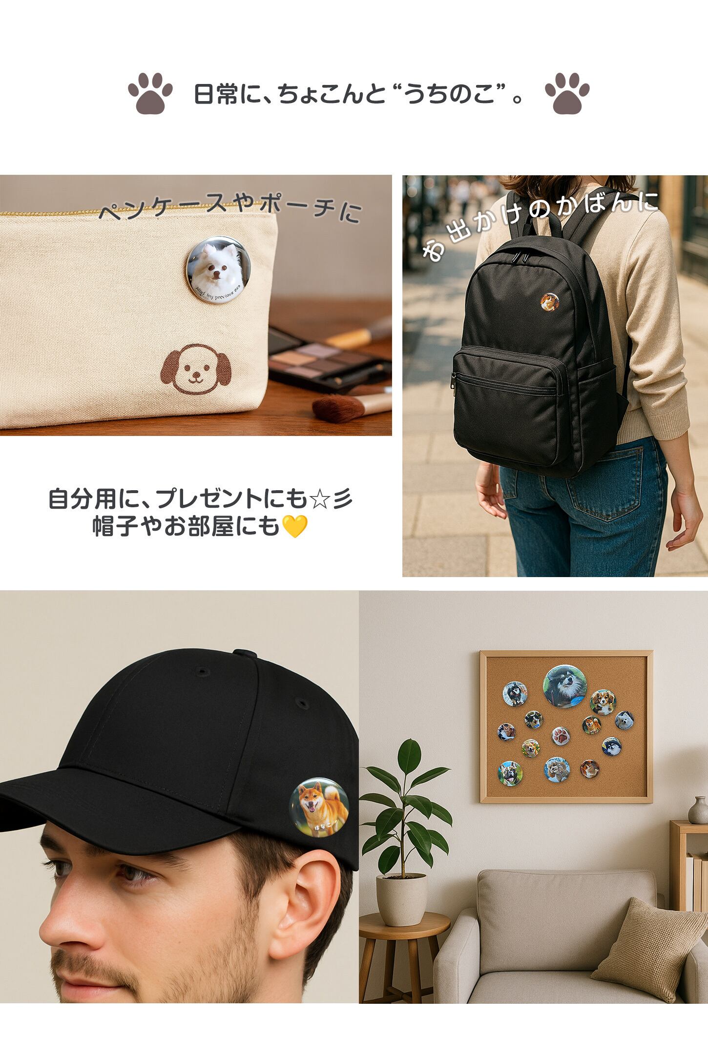 ペットの写真を使った仲間や家族のための記念バッジとしてもご利用いただけます。お気軽にお問い合わせフォームよりご相談ください♪